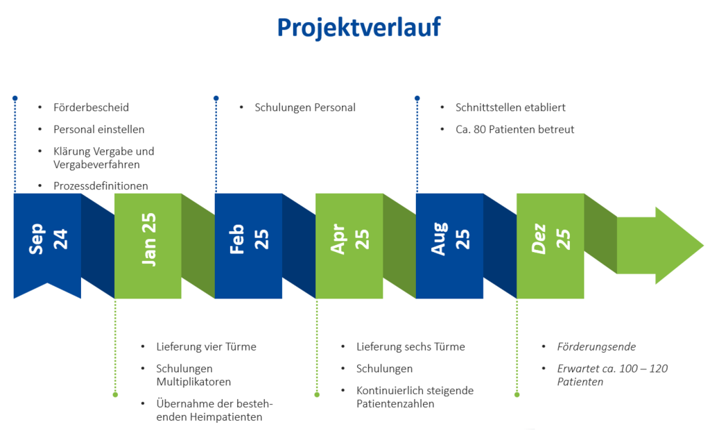 Seit Beginn des Jahres 2025 wurden insgesamt zehn Heime mit Rollständern bzw. sogenannten Videotürmen ausgestattet, die Beschäftigten in der Nutzung der Türme geschult und die Prozesse zwischen den Heimen und dem ärztlichen Team im MVZ definiert.